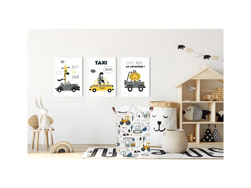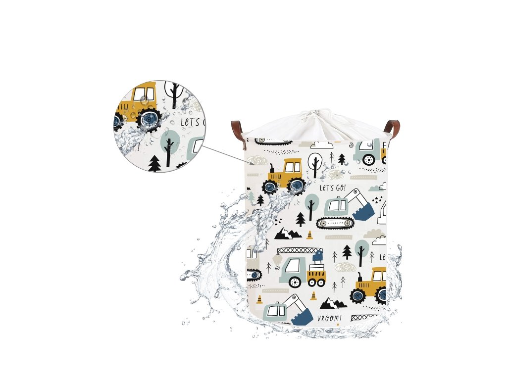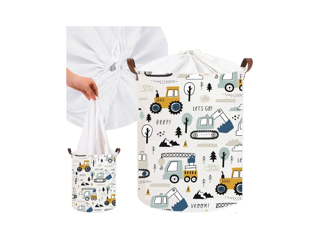 Koš na hračky, uzavíratelný, bavlna, Mini Trucks - bílý, 43 L