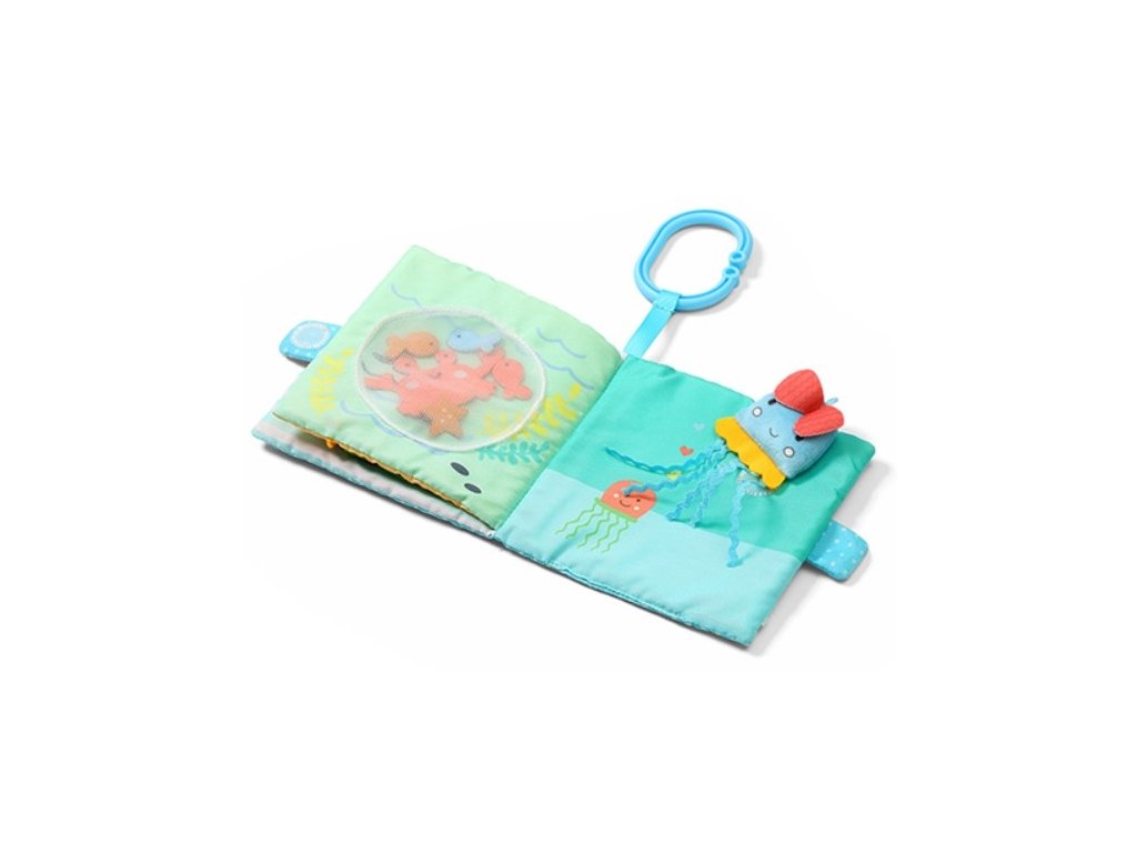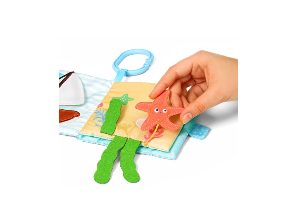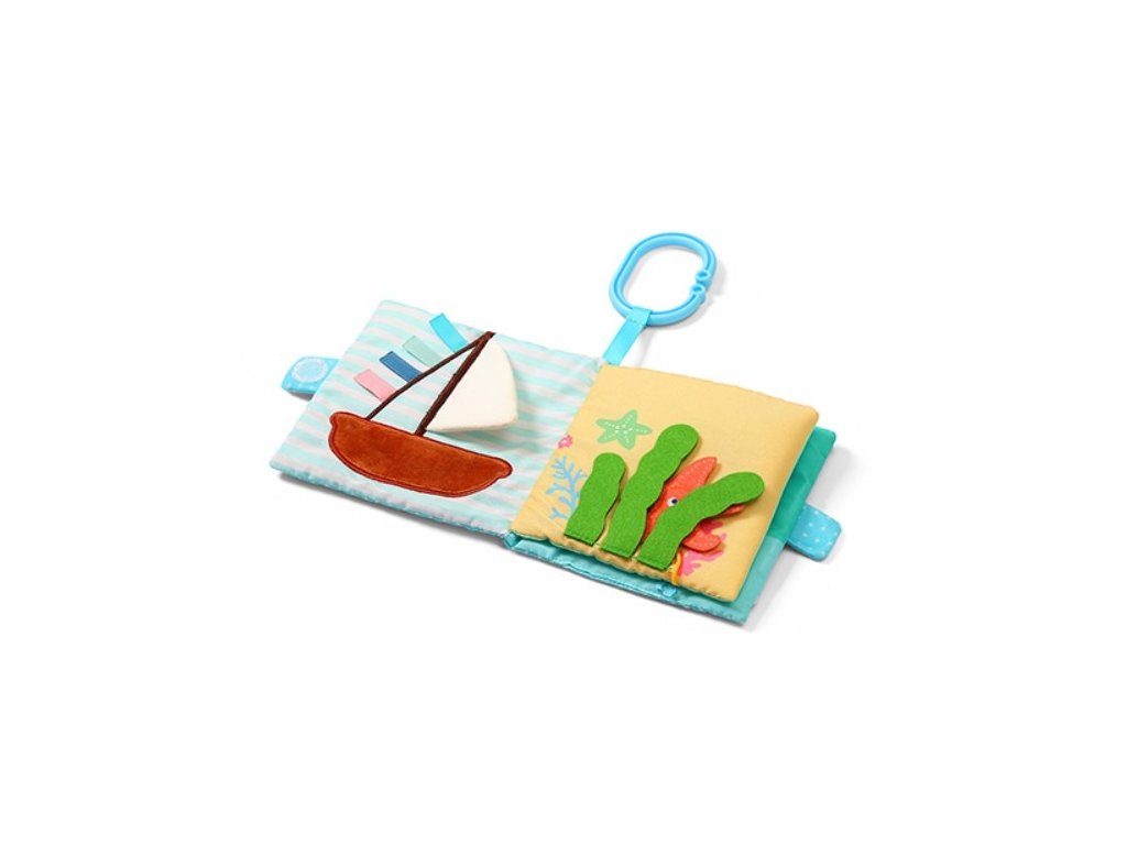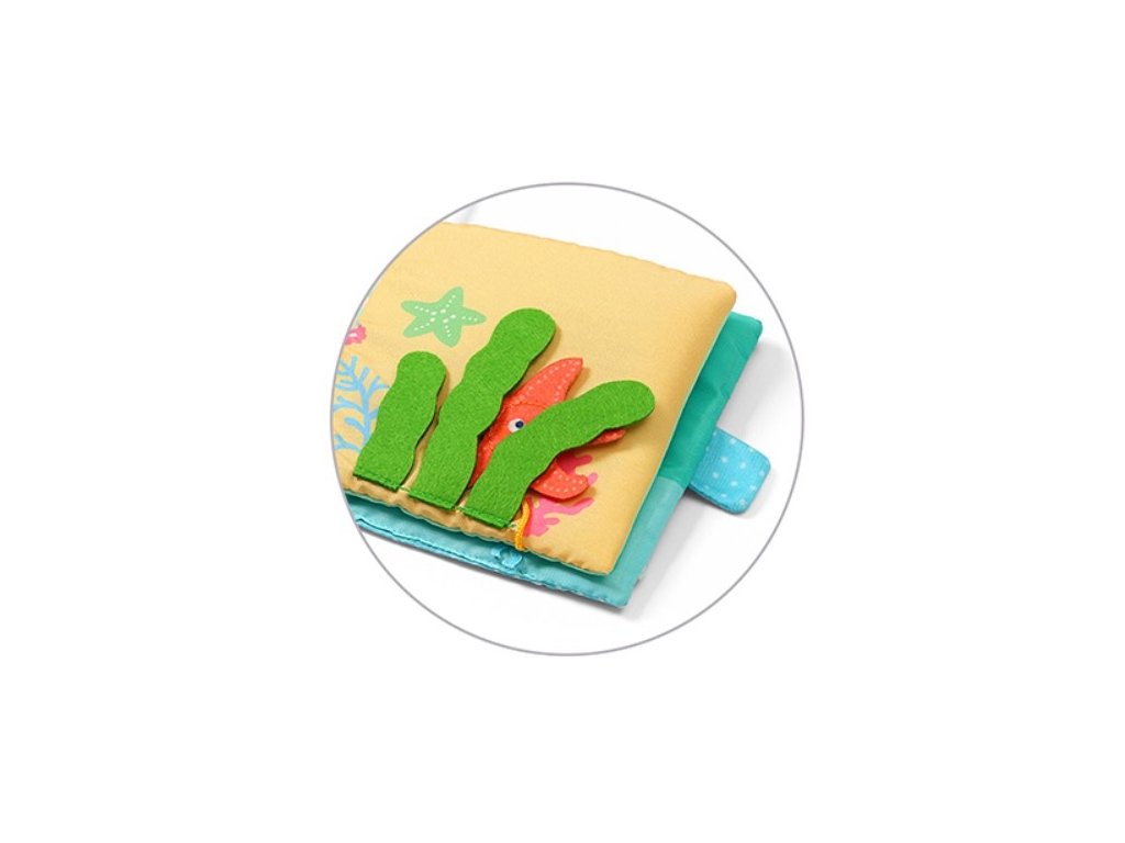 Senzorická knížka - SEA.Senzotická knížka Mořský svět odhalí vašemu dítěti fascinující podmořský svět. Stimuluje smyslový vývoj miminka od prvních dnů života. Různé materiály a textury stimulují hmat. Tkaniny, jako je plsť, jsou měkké a bezpečné. Zůstávají odolné i po intenzivní hře. Odnímatelný suchý zip a skryté prvky probouzejí zvědavost vašeho dítěte a povzbuzují je k samostatnému objevování. Rozvíjejí koncentraci a logické myšlení.
