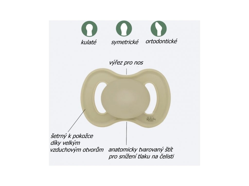 Silikonový dudlík Lullaby Planet má symetrickou savičku, která je vhodná pro děti, které dudlík otáčejí v ústech. Symetrický tvar savičky zaručuje správnou polohu dudlíku v ústech, i když si jej děti otočí.Silikon je průhledný syntetický materiál, který je bez zápachu a chuti. Velikost štítu byla přizpůsobena obličeji dítěte a motýlkový tvar ponechává dostatek místa pro nos, čímž je dosaženo nejlepšího možného přizpůsobení.