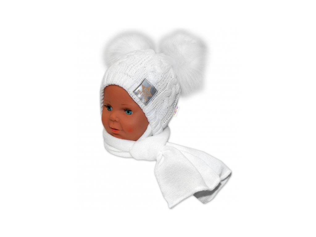 Zimní čepička s šálou - chlupáčkové bambulky - bílá,bílé bambulky